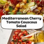 A vibrant Mediterranean cherry tomato couscous salad featuring a delightful mix of roasted and raw cherry tomatoes, feta cheese, chickpeas, fresh herbs, and cucumbers. This salad is perfect for picnics or quick lunches and benefits from roasting the tomatoes ahead of time to intensify their flavor and speed up preparation.