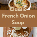 Classic French Onion Soup featuring caramelized yellow onions simmered in rich beef bone broth, topped with toasted French bread and melted Gruyère cheese, garnished with fresh parsley. This comforting soup highlights deep, savory flavors and a perfect cheese crust.