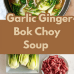 A flavorful and nourishing Garlic Ginger Bok Choy Soup featuring tender beef, a medley of mushrooms, fragrant ginger and garlic, and tender baby bok choy in a savory broth with rice noodles. This quick and easy stovetop soup is perfect for a comforting meal with rich umami notes and fresh vegetable goodness.