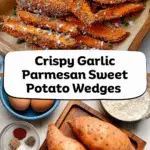 Garlic Parmesan Sweet Potato Wedges are a crispy, flavorful side dish baked to perfection in the oven. Coated with a seasoned mixture of Parmesan cheese, garlic, and herbs, these wedges offer a delicious and easy appetizer or snack, ideal for game day or any casual meal.