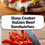 These Italian Beef Sandwiches feature tender, slow-cooked top round roast seasoned with Italian dressing mix and au jus gravy, simmered with bell peppers and served hot on hoagie rolls with provolone cheese and pepperoncini. Perfect for a flavorful, hearty meal that’s easy to prepare in a crock-pot.