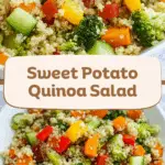Assemble the salad: In a large bowl, combine roasted sweet potatoes, cooked quinoa, broccoli, bell peppers, and cucumber. Stir gently to mix.