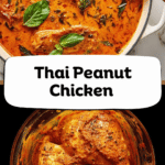 Thai Peanut Chicken with Spicy Lime Mango is a flavorful and creamy dish featuring tender chicken simmered in a rich Thai red curry peanut sauce, complemented by a refreshing, zesty mango salsa. This dish perfectly balances savory, sweet, spicy, and tangy flavors, making it a vibrant and satisfying meal served over steamed rice and garnished with roasted peanuts and fresh herbs.