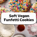 These soft and chewy vegan funfetti cookies are easy to make and bring a burst of color and joy to anyone’s inner child. With a nostalgic cake batter flavor and plenty of rainbow sprinkles, these cookies require no cutters and are perfect for celebrations or anytime you want a sweet treat.